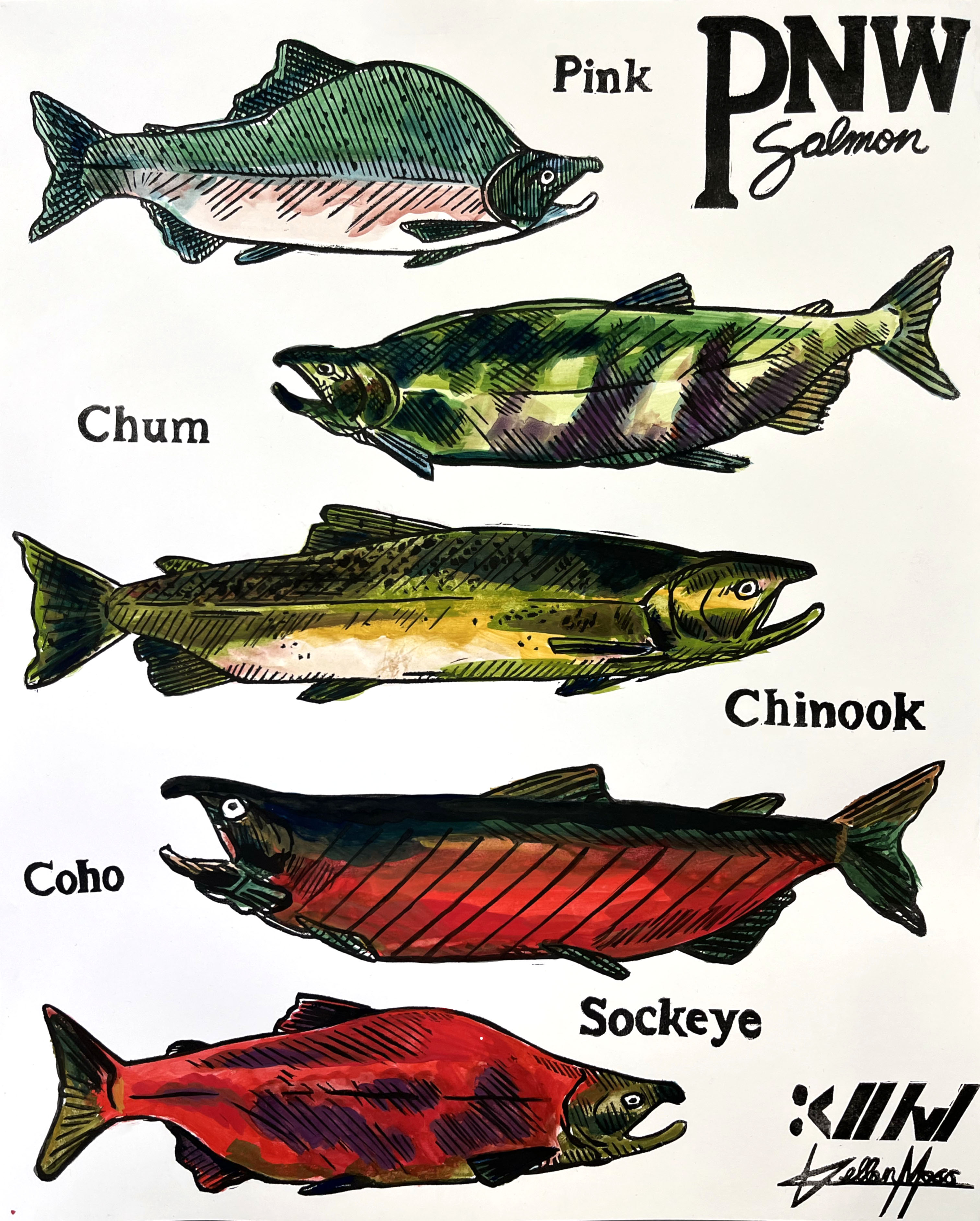 Pacific Northwest Salmon 2025 Block Print Bristol 17×14″ (Left), Bristol and Gouache 17×14″ (middle), Canvas Cloth 16×15″ (Right)