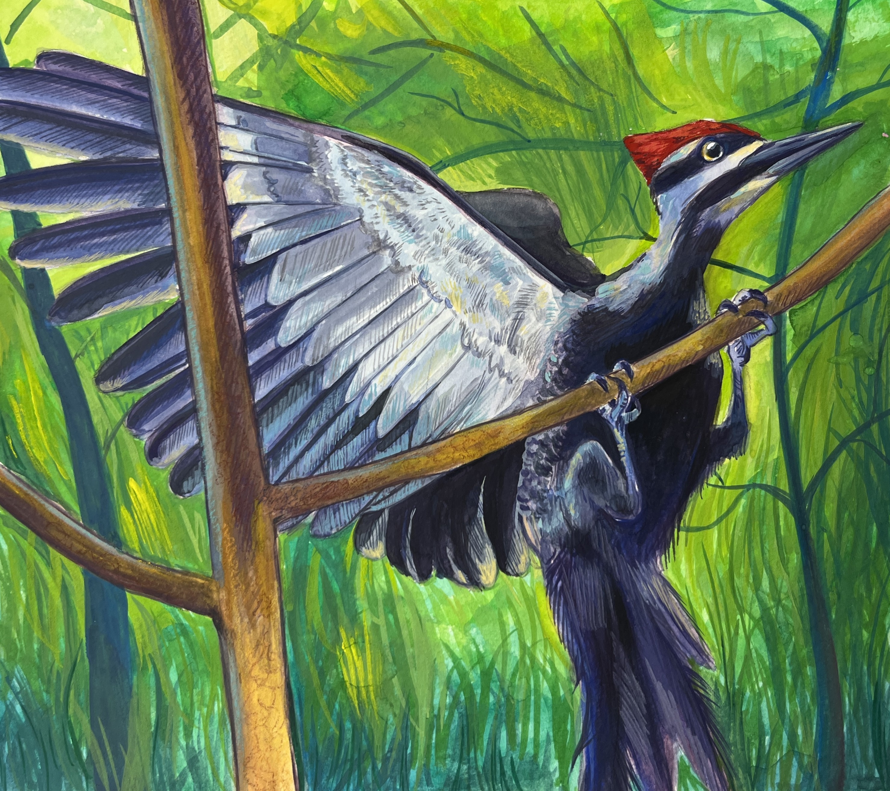 Stamp Series 2025 Gouache; Ants on Peonies (top left), Woodpecker (top right), Eastern Ratsnake (bottom left), Mink (bottom right)